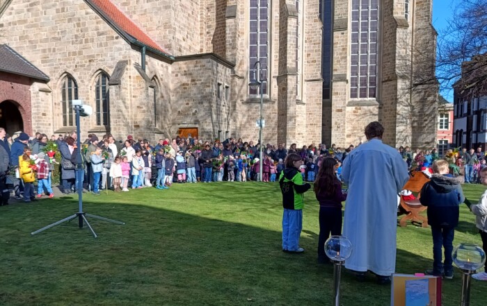 Kinder singen am Marktpütt Stadtlohn Bei fast sommerlichen Temperaturen haben sich zahlreiche Kinder mit ihren Eltern am Marktpütt zum Palm-Poasken-Singen eingefunden. Zuvor besuchten die Familien in der St. Otger-Kirche die Wort-Gottes-Feier zum Palmsonntag, in der